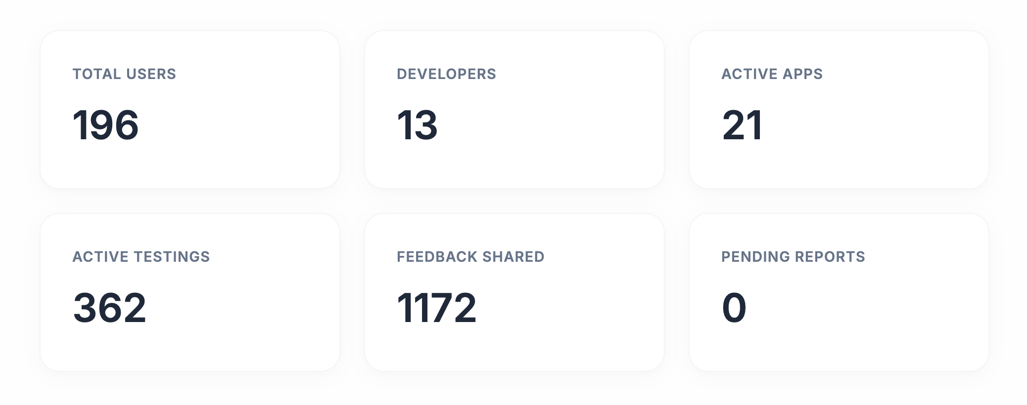 We made it!!! Total Users: 202 Developers: 14 Active Apps: 22 Active Testings: 372 Feedback Shared: 1193 Pending Reports: 0