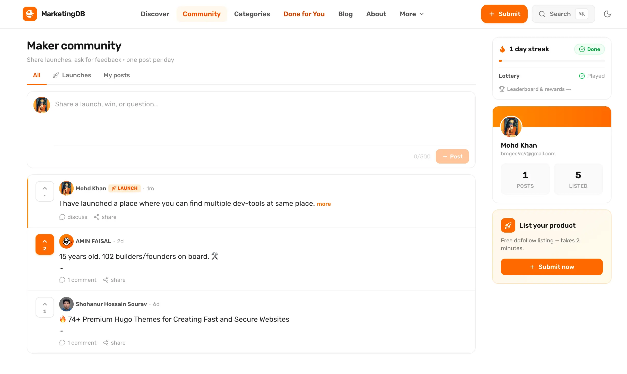 Working On Simple Community Site to share ideas, launch and something-idea. How is it looking overall? Share yours : https://marketingdb.live/community
