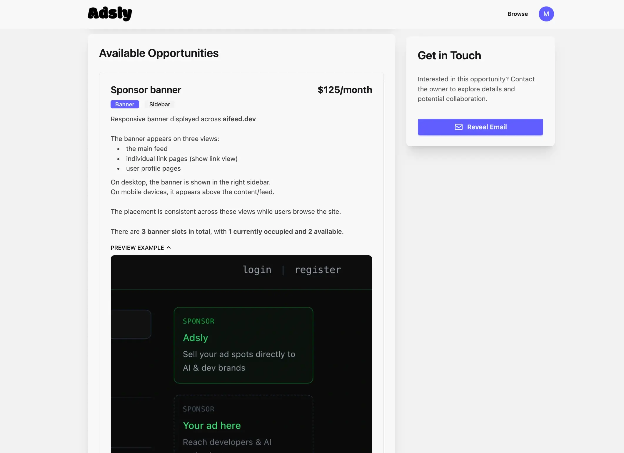 Want more visibility on Adsly? Add sponsorship opportunities to your listing. They appear in advanced filters and let advertisers instantly see what you offer. You can add them from the listing view in your dashboard. They show at the bottom of the listing.