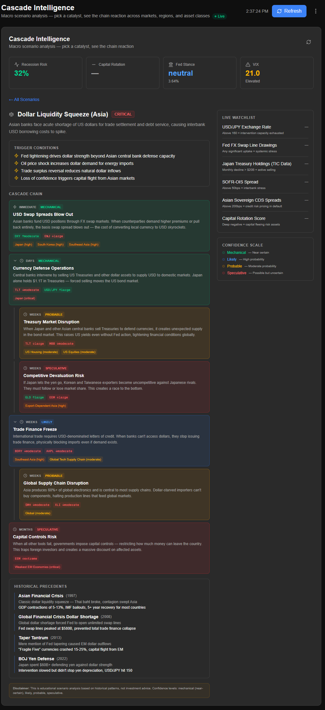 Built out new liveboard today for Tenant.so, this is economic situations played out, for example if you saw a headline yesterday "Asia is running out of dollars" but had no idea what that means or what comes next, this will tell you- Cascade Intelligence