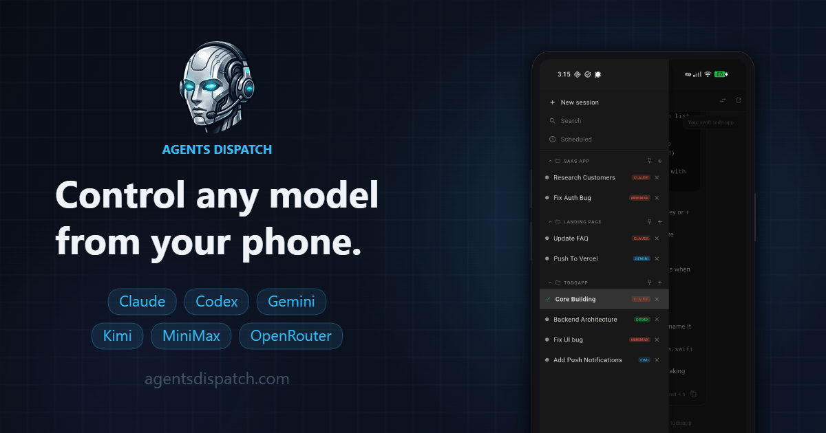 Agents Dispatch allows users to launch, manage, and control AI coding agents from a single interface. It supports various AI models including Claude, Codex, Gemini, Kimi, and OpenRouter, and is self-hosted on multiple platforms such as Windows, macOS, Linux, iOS, and Android. Users can keep their agents running continuously, even while they sleep, and have the flexibility to control desktop agents from their phones in real time. The platform enables the creation of unlimited sessions across projects, allowing users to resume any session exactly where they left off. Additionally, it features voice dictation capabilities, enabling hands-free interaction with agents using Whisper, which is included for free. Agents Dispatch operates without model fees, as users pay providers directly.