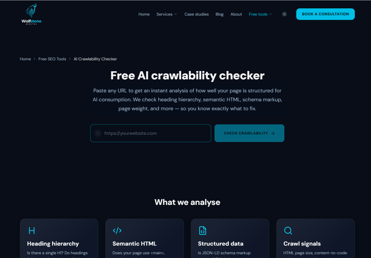 The AI Crawlability Checker analyses your website's technical setup to determine how accessible it is to AI crawlers including GPTBot, PerplexityBot and Google-Extended. Identifies crawlability issues that prevent your content from being indexed by AI platforms — a critical factor in any GEO and LLM visibility strategy. No signup required. Free to use.