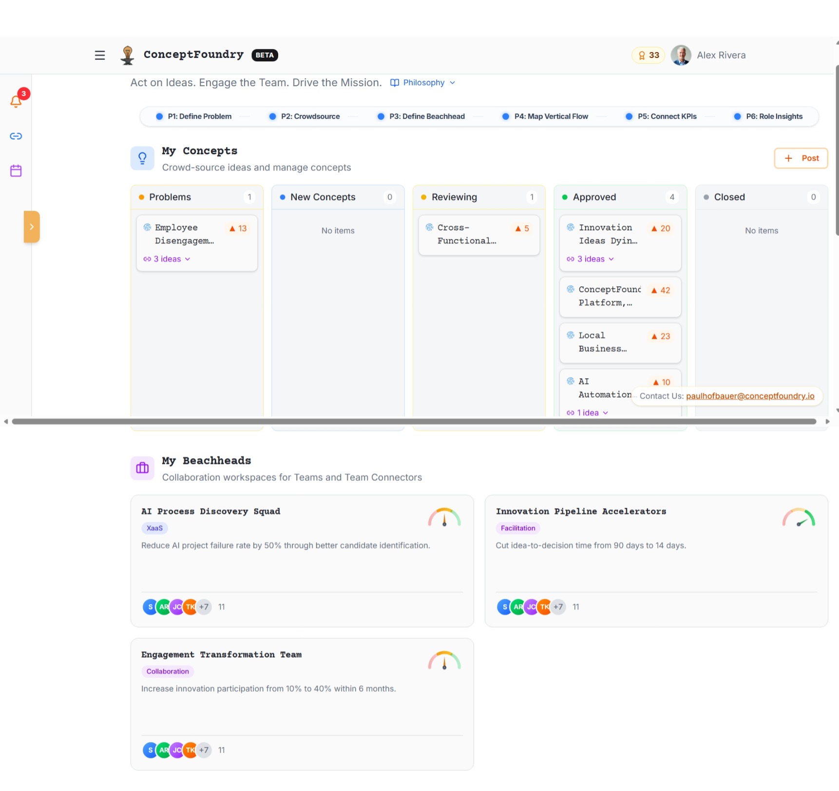 ConceptFoundry is an AI‑Age Organizational Optimization system that blends expert consulting with a structured SaaS platform. What we've built is called an innovation management system — or more precisely, an AI-age organizational optimization platform. It's the infrastructure that turns the problems you just recognized — the dying ideas, A consulting engagement builds your process. A platform runs it automatically.