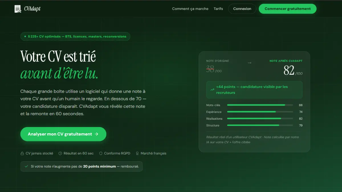CVAdapt compare votre CV à une offre d'emploi et vous donne un score de compatibilité avec les améliorations exactes à faire. 3 essais gratuits.