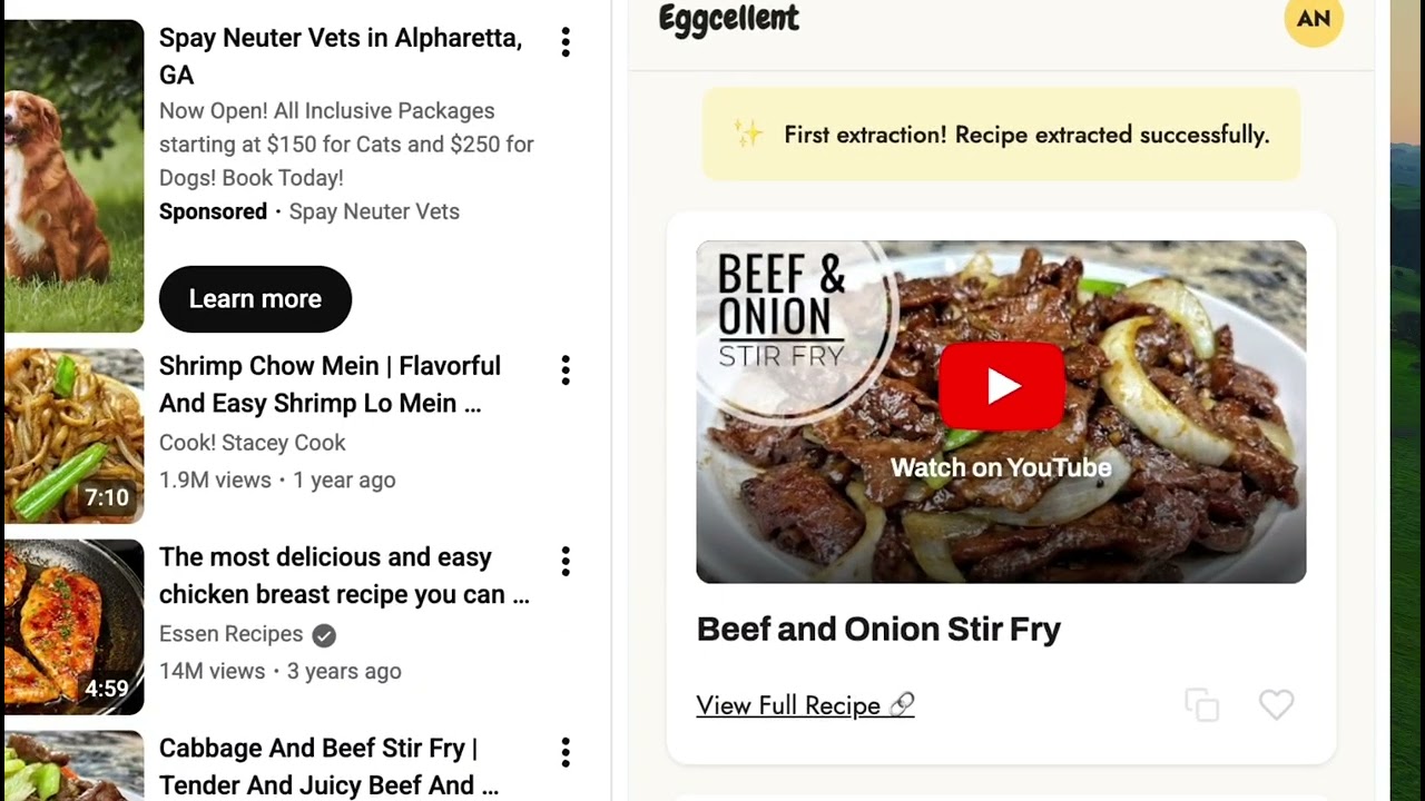 Say goodbye to recipe chaos. Eggcellent.io is the AI tool that instantly converts messy cooking videos (YouTube, TikTok, X) and cluttered recipe websites into clean, organized formats. Just paste the link—our AI pulls out accurate ingredients, quantities, step-by-step directions, and key details while removing sponsors, chit-chat, and distractions. Get scannable, printable recipes ready for your kitchen. Build your personal digital cookbook effortlessly. Fast, accurate, ad-free—Eggcellent.io