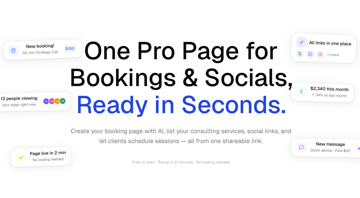 Gluer gives you one professional page to share your services, accept bookings, and connect your social links. Built for consultants, creators, coaches, and freelancers.