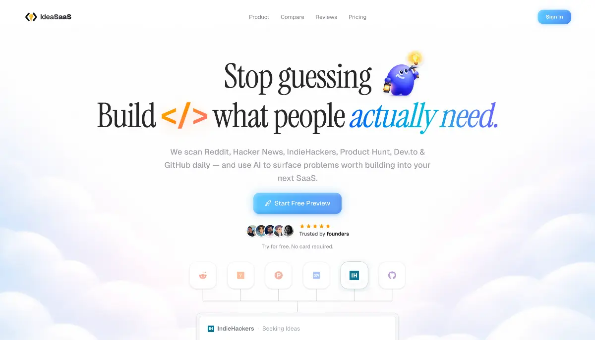 IdeaSaaS helps technical founders discover repeated pain points from communities like Reddit, Hacker News, Indie Hackers, Dev.to, GitHub, and Product Hunt. Instead of random startup ideas, it surfaces source-backed opportunities you can inspect, research, and validate before wasting weeks building the wrong thing. It starts with a no-card preview so users can try the real dashboard first.