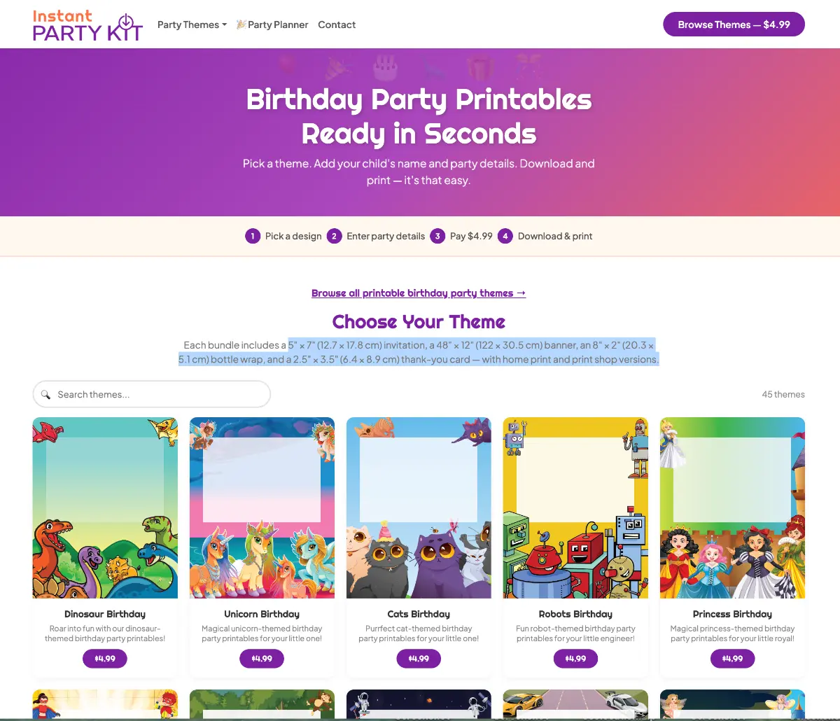 Instant Party Kit is a personalized birthday party printable bundle generator. Parents pick from 44+ themed designs — like dinosaurs, princesses, superheroes, and unicorns — enter their child's name, age, and party details, and instantly download a ready-to-print PDF bundle that includes invitations, banners, cupcake toppers, and thank you cards. Every bundle is $4.99, with no subscriptions or design skills required. Built for busy parents who want a polished, coordinated party look without the hassle of DIY design tools or the wait time of custom Etsy orders.