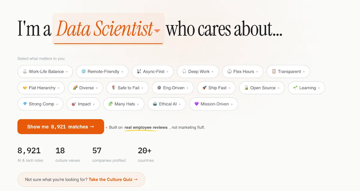 Hey everyone! 👋 I’m Pradeep, maker of JobsByCulture — a culture-first job board for AI & tech roles. Filter jobs by how teams actually work (not just perks). Built from real employee reviews.
