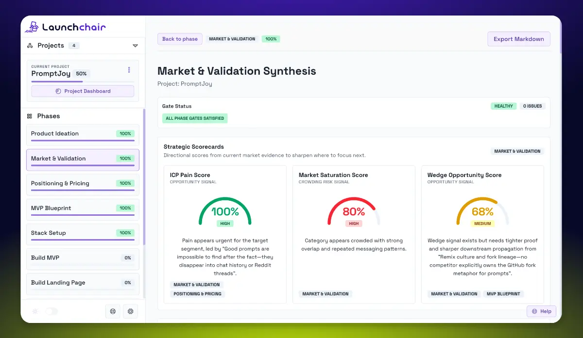 LaunchChair helps founders turn a messy idea into a wedge worth building. It shows where the pain is strongest, who the real customer is, what competitors and substitutes get wrong, and what your first killer workflow should be. Then it turns that into a living product spec and dynamic, context-aware prompts for the LLM's you already use... so you can move from idea to MVP to launch with clarity, continuity, and a real plan.