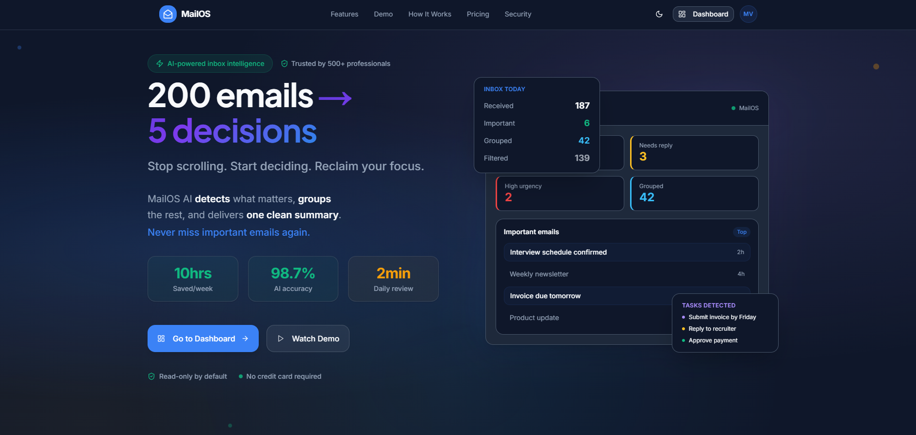 MailOS is an AI-powered email management tool designed to help users regain focus by detecting important emails and grouping the rest. It transforms your inbox from chaos to clarity by delivering a clean daily summary of emails, allowing you to make quick decisions without the need for a new email client. MailOS provides secure read-only access and does not store any user data. It categorizes incoming emails by intent, ensuring that newsletters and promotions are grouped out of the way. With MailOS, users can save hours of scrolling through emails and never miss important replies or deadlines again.
