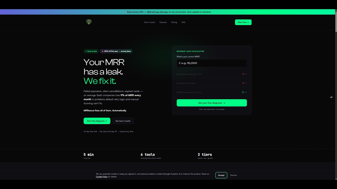MRRescue is a tool designed to recover failed payments for SaaS businesses using Stripe. It addresses the issue of lost Monthly Recurring Revenue (MRR) due to failed payments and silent churn, which can account for 9% of MRR each month. While Stripe's built-in retry logic only recovers a small fraction of these payments, MRRescue enhances recovery efforts through automated dunning, smart retries, and cancel save flows. Users can connect their Stripe account with a read-only OAuth key in under 5 minutes, without any development work required. The service provides a diagnosis of the last 90 days of payment failures, allowing businesses to see exactly how much MRR they have been losing. Key features include automated dunning emails, retries, and cancel saves, all initiated from day one. Additionally, MRRescue offers a real-time dashboard, Slack alerts, and weekly AI digests to keep users informed about their recovery efforts.