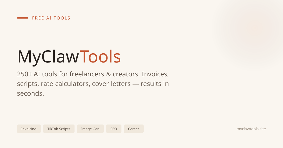 MyClaw Tools offers over 250 free AI tools designed specifically for freelancers and creators. Users can access tools such as an invoice generator, rate calculator, TikTok scripts, and cover letters without the need for signup. The platform aims to help users get paid quickly, with a promise of payment in just 30 seconds.