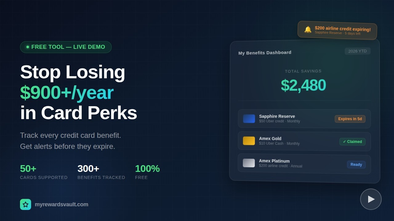 MyRewardsVault helps users track every credit card and membership benefit in one place, ensuring they never miss out on valuable credits. The platform provides alerts before credits expire, covering various benefits from select restaurants, flights, hotels, and more. Users can select from a library of over 50 credit cards and memberships, with benefits pre-loaded for convenience. The dashboard displays each benefit, its value, and reset schedule, allowing users to mark benefits as used as they claim them. MyRewardsVault aims to maximize users' perks by tracking expiration dates and calculating the value of their cards.