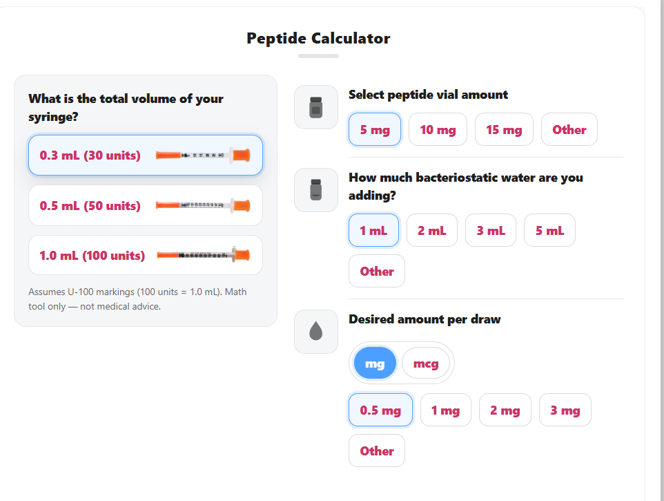 The Peptide Reconstitution Calculator is a free tool designed to help users calculate the concentration, units, and draw volume of peptides after reconstitution. It allows for the conversion of various peptide doses, such as BPC-157, retatrutide, semaglutide, tirzepatide, TB-500, HGH, ipamorelin, and MOTS-C, from milligrams or micrograms to insulin syringe units. Users can enter their vial size, the amount of bacteriostatic water added, and their desired dose to instantly determine the correct number of insulin syringe units needed. This calculator is particularly useful for those working with peptides and needing precise dosage calculations.