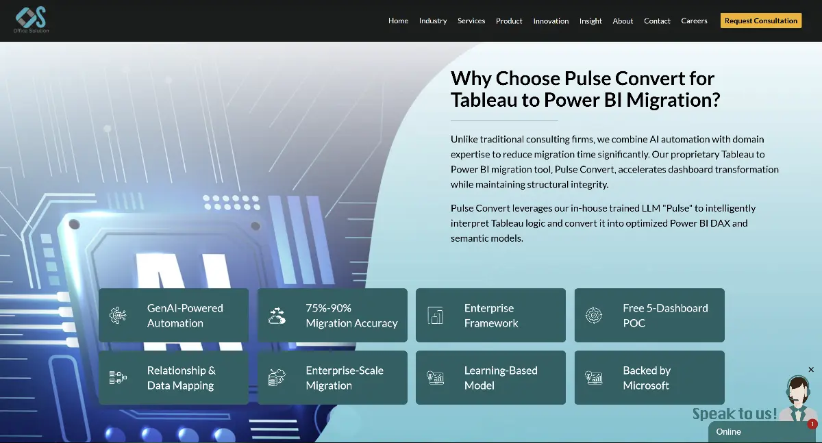 Pulse Convert is an AI-powered automation engine designed to accelerate transitions from Tableau to Power BI. Developed by Office Solution AI Labs, it replaces manual rebuilding with a Generative AI approach that translates complex metadata into functional Power BI files.