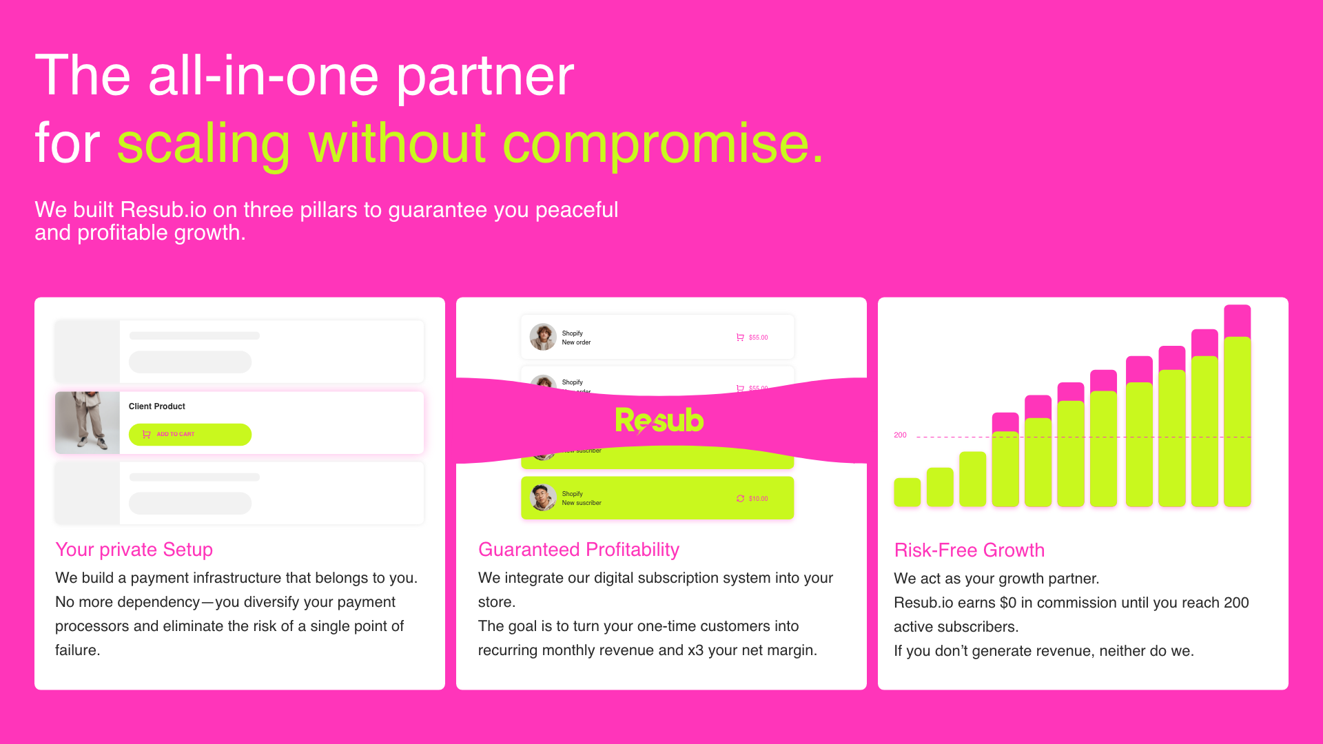Resub helps merchants build recurring revenue by transforming one-time customers into subscribers. It offers a payment infrastructure that merchants own, reducing dependency on third-party platforms and minimizing risks associated with payment blocks. By integrating a 'done-for-you' subscription system, Resub enables businesses to double their profit margins and customer lifetime value. Merchants using subscriptions can see margins multiply up to 4.5 times, providing a stable cash flow and predictable revenue. Resub is designed for those looking to regain control over their payments and achieve sustainable growth without the complexities of traditional subscription solutions.