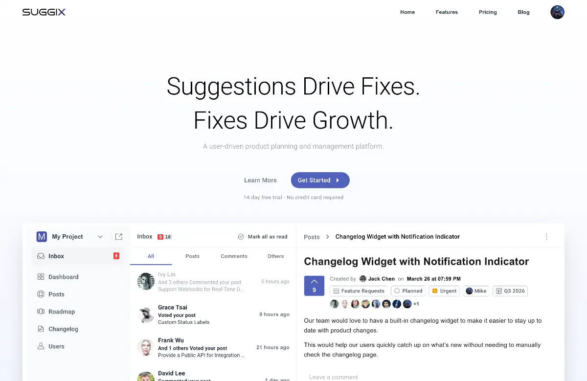 Suggix is a user-driven product planning and management platform that helps teams collect user feedback, prioritize features, and make data-driven decisions. It centralizes user feedback to identify what matters most, allowing teams to turn insights into actionable product decisions. With features like a changelog widget with notification indicators, Suggix enables teams to monitor user engagement and product usage trends effectively. The platform allows for assigning ownership of tasks, setting priorities, and tracking progress to ensure accountability and focus on delivering maximum impact. Suggix offers a 14-day free trial with no credit card required.