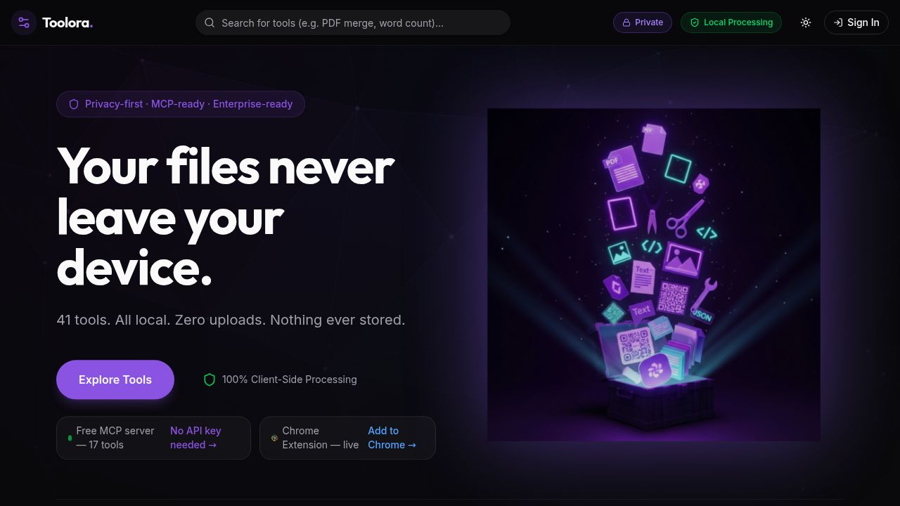 Toolora offers 28 free online tools including PDF merge, OCR, image compression, JSON formatter, QR codes, and audio transcription. It features a free MCP server for Claude Desktop and Cursor. All processing is done in your browser without the need for uploads, accounts, or tracking.