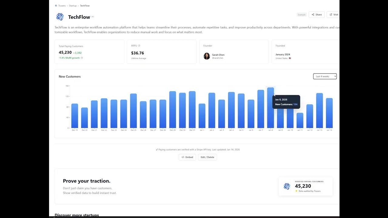 Build instant trust with Trusers. Connect your Stripe account to automatically validate your paying customer count. You get a verified profile on our leaderboard and a live "Trust Badge" to embed on your website.