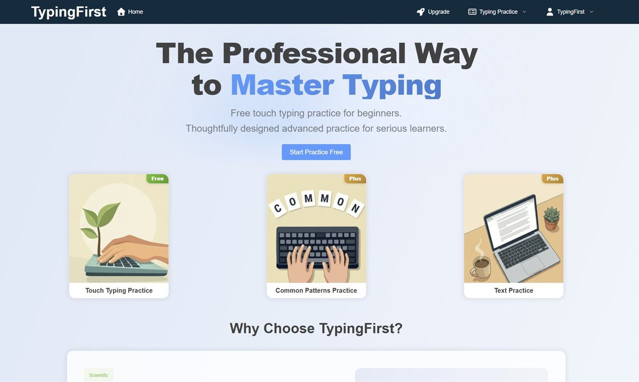 TypingFirst offers free touch typing practice designed for both beginners and serious learners. The platform utilizes scientifically proven finger placement techniques to facilitate natural typing, covering everything from basic home row keys to complex symbols. Its curriculum is crafted for rapid muscle memory development, featuring integrated reviews that combine new keys with previously learned skills. Users can enjoy gamified milestones to maintain motivation, and the service provides instant access with no complex setup required. The minimalist interface promotes deep focus, while real-time visual feedback enhances the learning experience. After each lesson, comprehensive accuracy and speed analysis helps users identify weak keys and optimize their practice routine.