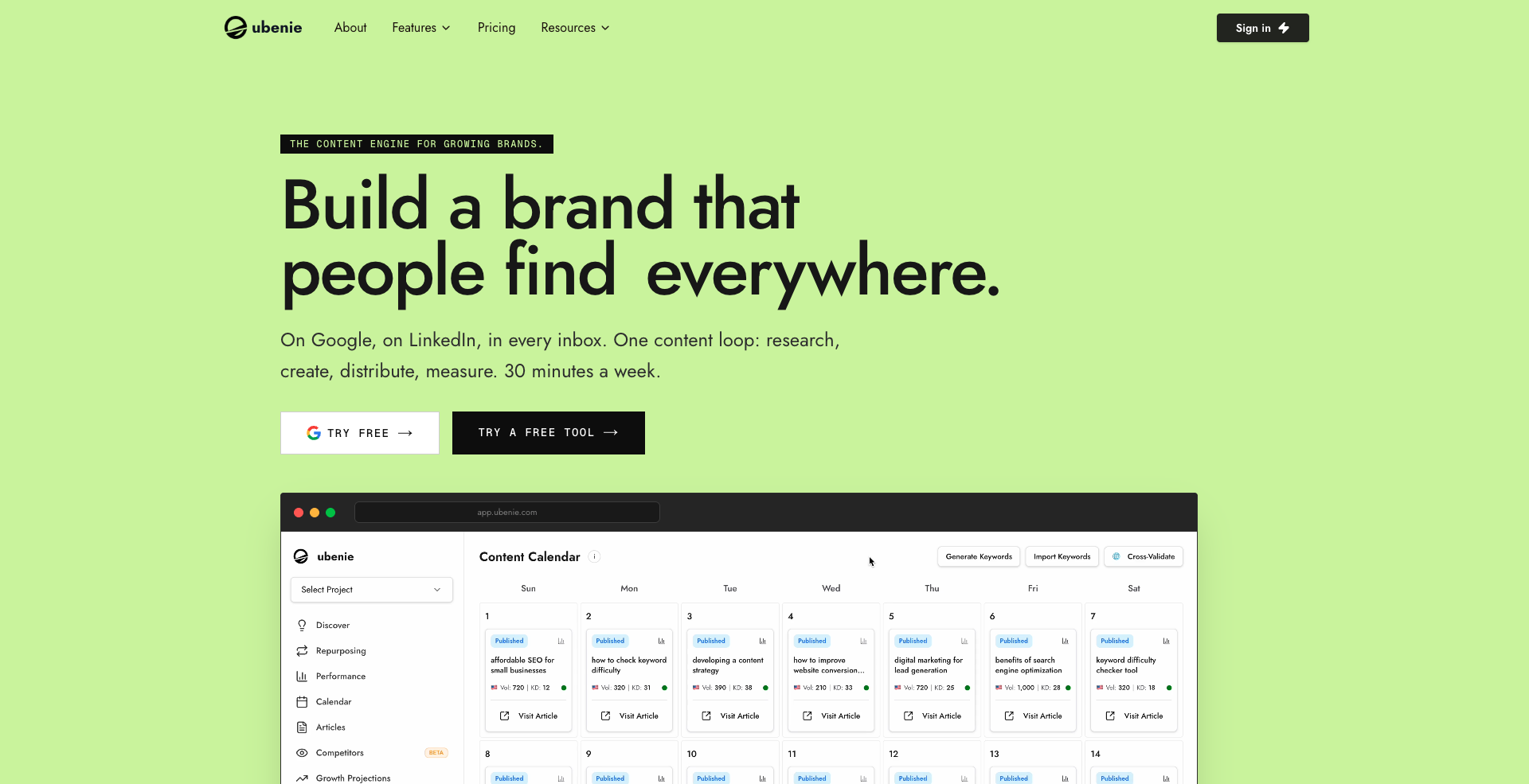 Ubenie is a content engine that connects SEO and content marketing in one tool. It allows users to research keywords, generate articles, publish content across various platforms, and track performance, all within a streamlined workflow that can be managed in just 30 minutes a week. Ubenie helps brands build a consistent online presence by automating the content creation process. Users can connect their website, review a generated content plan, and start publishing immediately. The tool scans the user's site to detect their niche, identify competitors, and generate keyword opportunities. It builds a 30-day content plan that outlines which keywords to target, what type of articles to write, and when to publish them. Articles are created in the user's brand voice, optimized for SEO, and published directly to their website, while social media posts are distributed to platforms like LinkedIn and X. Performance tracking is automated, ensuring that users can see what is working without the hassle of managing multiple tools. Ubenie integrates SEO and content marketing into a single system, making it easier for brands to find what their audience is searching for and which topics they can rank for effectively.