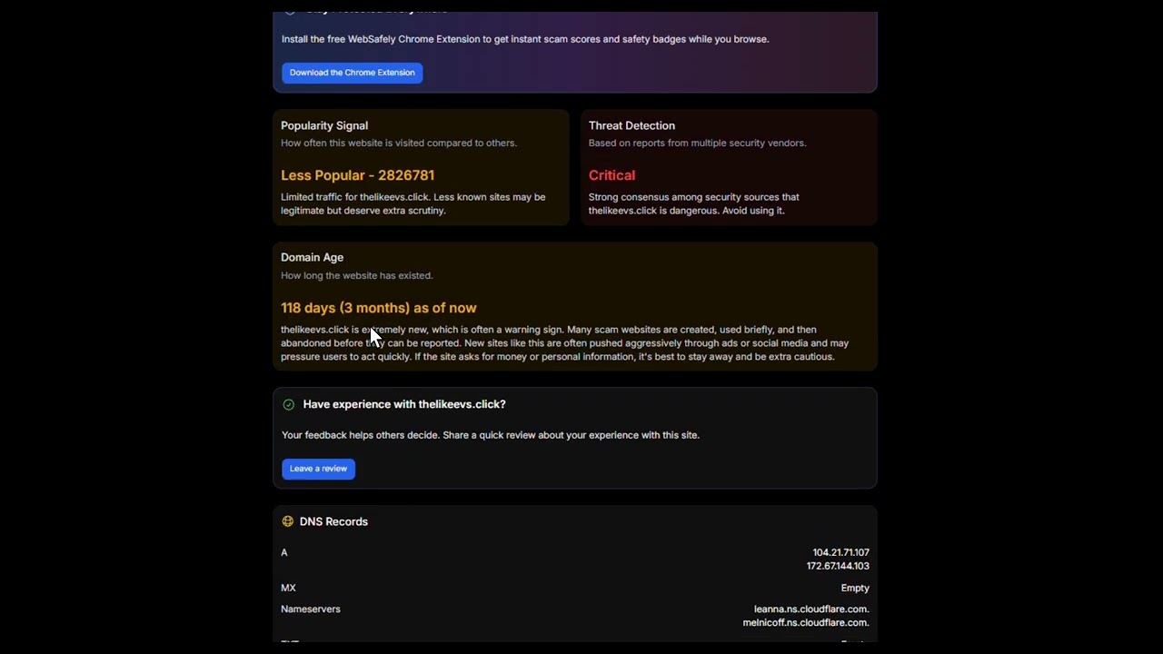 WebSafely offers real-time scam detection and domain intelligence. It helps you determine whether a website is legitimate or potentially a scam based on domain age, threat level, Popularity, site content, server and other 40+ trust signals from the site and external sources using Machine Learning Model.